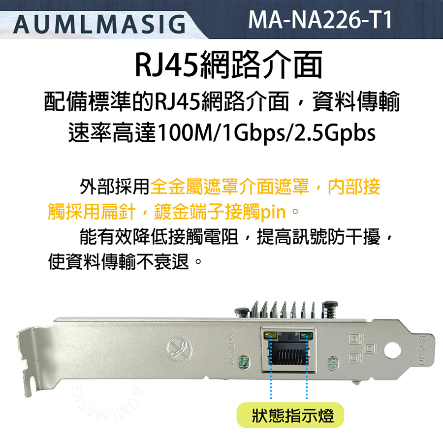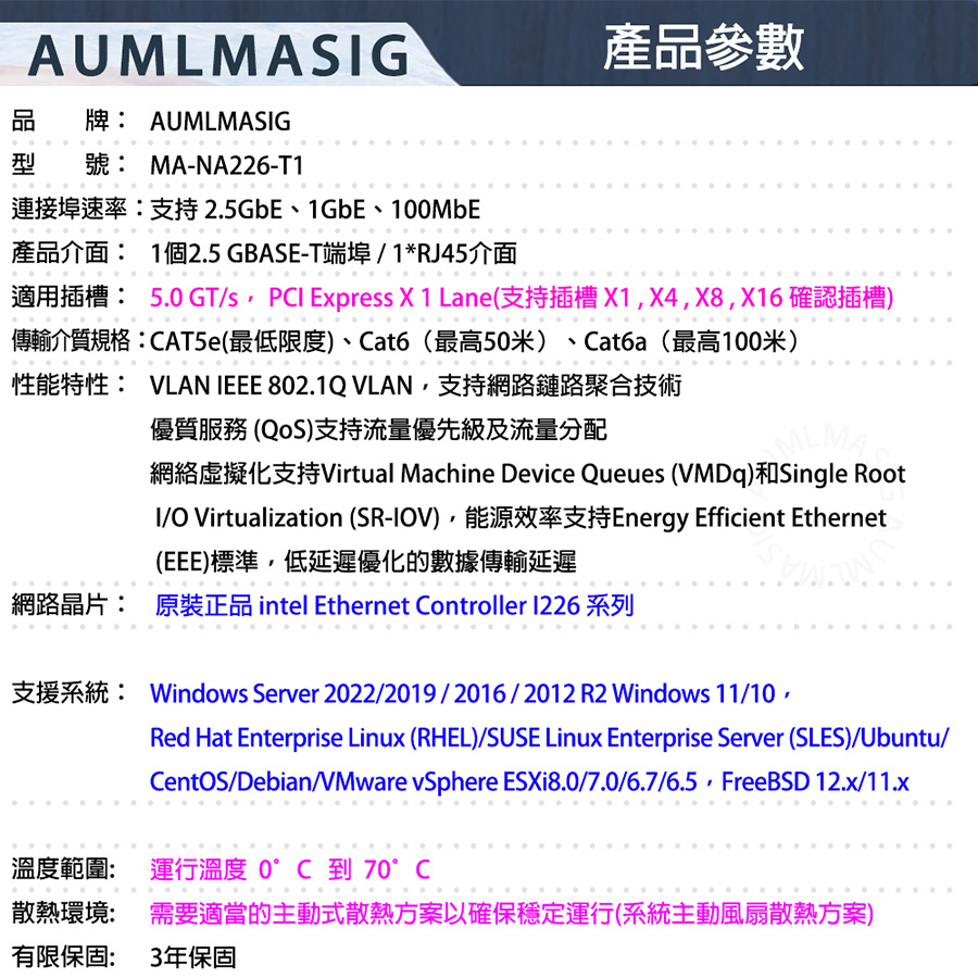 【AUMLMASIG全通碩】1 PORT 2.5 Gbps Ethernet Adapters Intel NA226-T1 2.5GbE 乙太網路聚合介面卡 支持windows server/LINUX/VMware 1 PORT RJ-45插槽 適用企業IT/工作站/NAS/資料中心/虛擬中心/高速網路/資料庫速度提供高達2.5Gbps