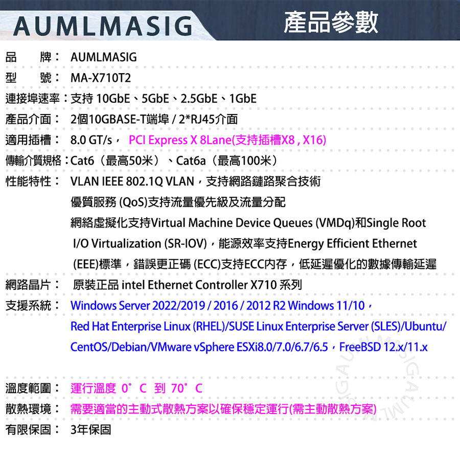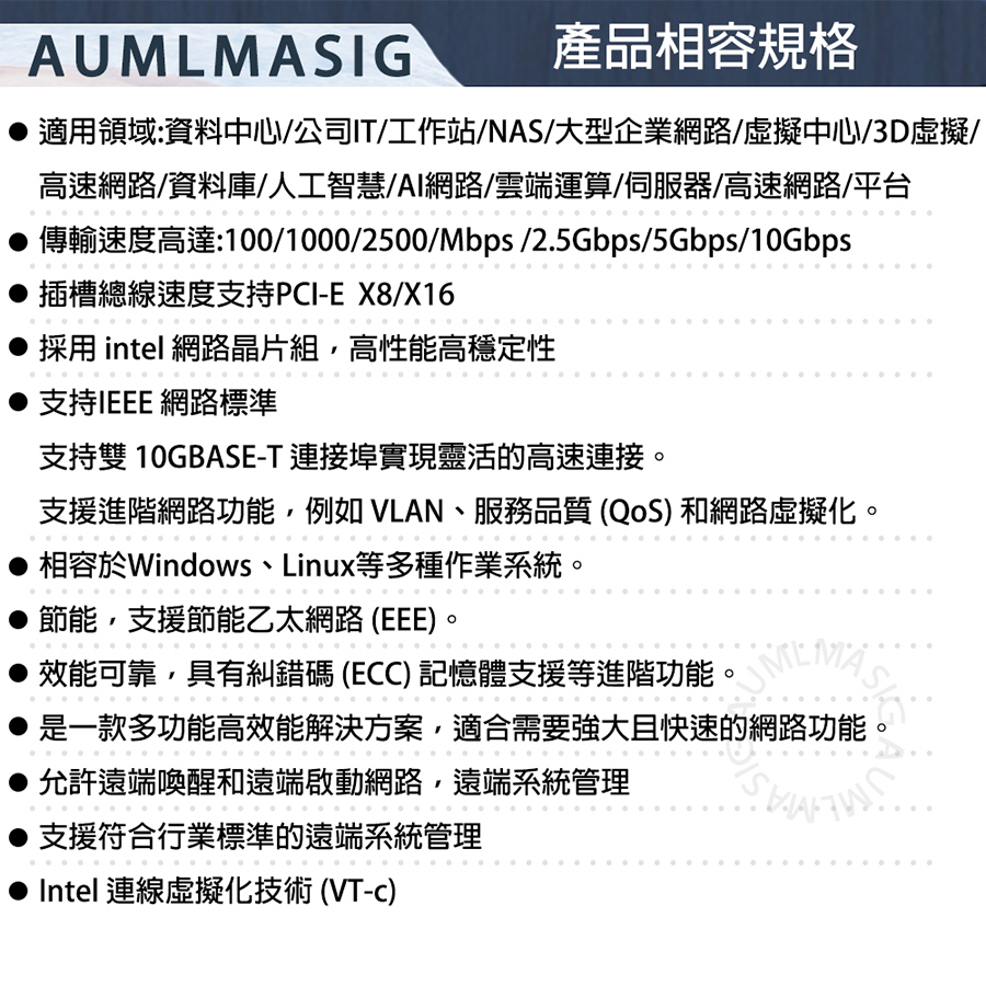 [AUMLMASIG] 2 PORT 10 Gbps Ethernet Adapters 10GE INTEL 乙太網路聚合介面卡 windows server/LINUX/VMware 2 PORT RJ-45插槽 VLAN 支援/SR-IOV支持 支持網路虛擬化/虛擬機設備 原裝INTEL網路晶片 暢快穩定性能強+保固3年