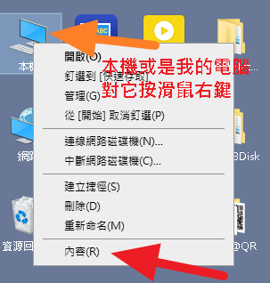 上圖:找到我的電腦或是本機滑鼠右鍵選擇內容