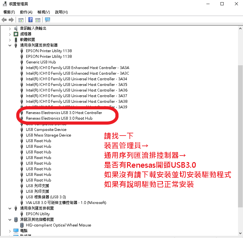 上圖:裝置管理員中的通用序列匯流排控制器是否有Renesas開頭USB3.0