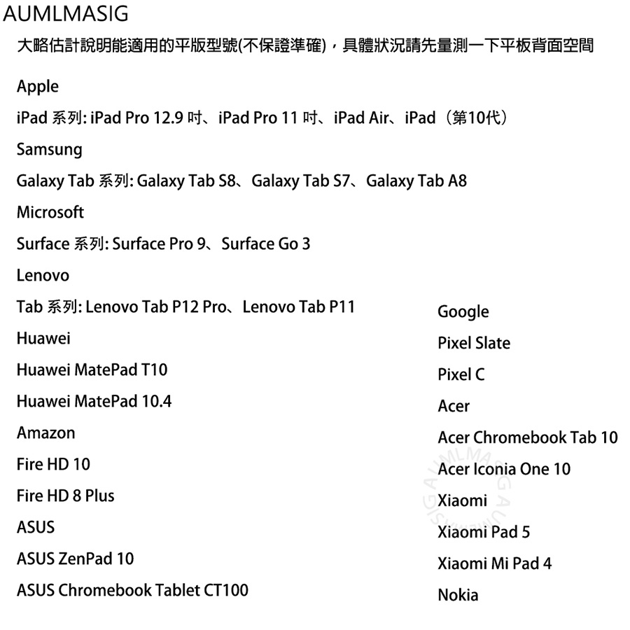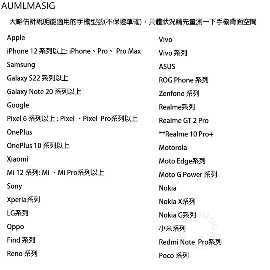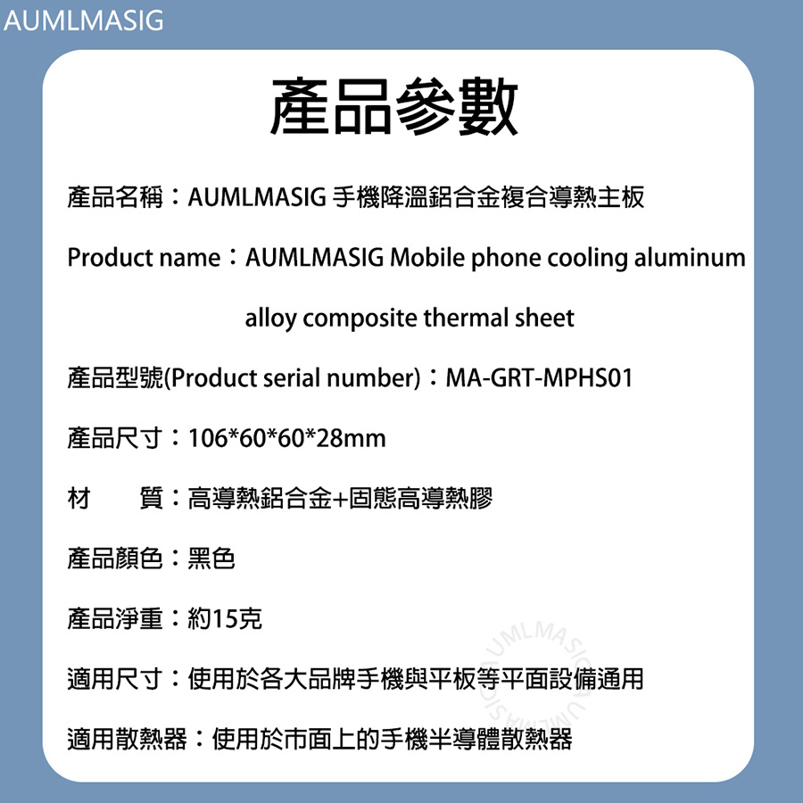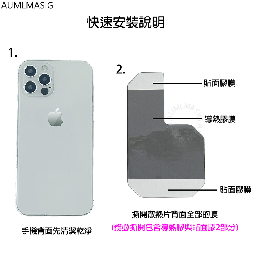 AMASIGAUMLMASIG搭配背夾款散熱器散熱主板雙向熱傳導無方向性MASAUMLMASIOAUMLMASIG熱到冷傳遞無安裝方向性快速安裝說明1手機背面先清潔乾淨AUMLMASIG2.貼面膠膜UML MAS導熱膠膜貼面膠膜撕開散熱片背面全部的膜務必撕開包含導熱膠與貼面膠2部分)AUMLMASIO壓緊上半部與下半部10~30s即完成AUMLMASIG產品尺寸60mm90AUMLMASIO60mm28mmAUMLMASIG產品參數產品名稱AUMLMASIG 手機降溫鋁合金複合導熱主板duct name AUMLMASIG Mobile phone cooling aluminumalloy composite thermal sheetProduct serial number) MAGRT-MPHS01R106*60*60*28mm材質高導熱合金+高導熱膠產品顏色黑色產品淨重約15克UML適用尺寸使用於各大品牌手機與平板等平面設備通用適用散熱器:使用於市面上的手機半導體散熱器AUMLMASIGAUMLMASIGAUMLMASIG4444444AUMLMASIO444444AUMLMASIOAUMLMASIO - SIGAUAUMLMASIG大略估計說明能適用的手機型號(不保證準確)具體狀況請先量測一下手機背面空間Apple、 12: iPhone Pro Pro MaxSamsungGalaxy Galaxy Note 20 系列以上GooglePixel 6 系列以上:Pixel、Pixel Pro系列以上OnePlusOnePlus 10Xiaomi 12:  Mi Pro系列以上SonyXperia系列LG系列Find 系列VivoVivo 系列ASUSROG Phone 系列Zenfone 系列Realme系列Realme GT 2 ProRealme 10 Pro+MotorolaMoto Edge系列Moto G Power 系列NokiaNokia X系列Nokia G系列小米系列MASIGRedmi Note ProReno 系列Poco 系列AUMLMASIG大略估計說明能適用的平版型號(不保證準確),具體狀況請先量測一下平板背面空間Apple  Pro 12.9  Pro 11 iPad Air, iPad ()SamsungGalaxy Tab : Galaxy Tab S8. Galaxy Tab S7 Galaxy Tab A8MicrosoftSurface: Surface Pro  Surface Go 3LenovoTab: Lenovo Tab P12 Pro Lenovo Tab P11HuaweiHuawei MatePad T10Huawei MatePad 10.4AmazonFire HD 10Fire HD 8 PlusGooglePixel SlatePixel CASUSASUS ZenPad 10ASUS Chromebook Tablet CT100AcerAcer Chromebook Tab 10MLMAAcer Iconia One 10XiaomiXiaomi Pad 5Xiaomi Mi Pad 4Nokia