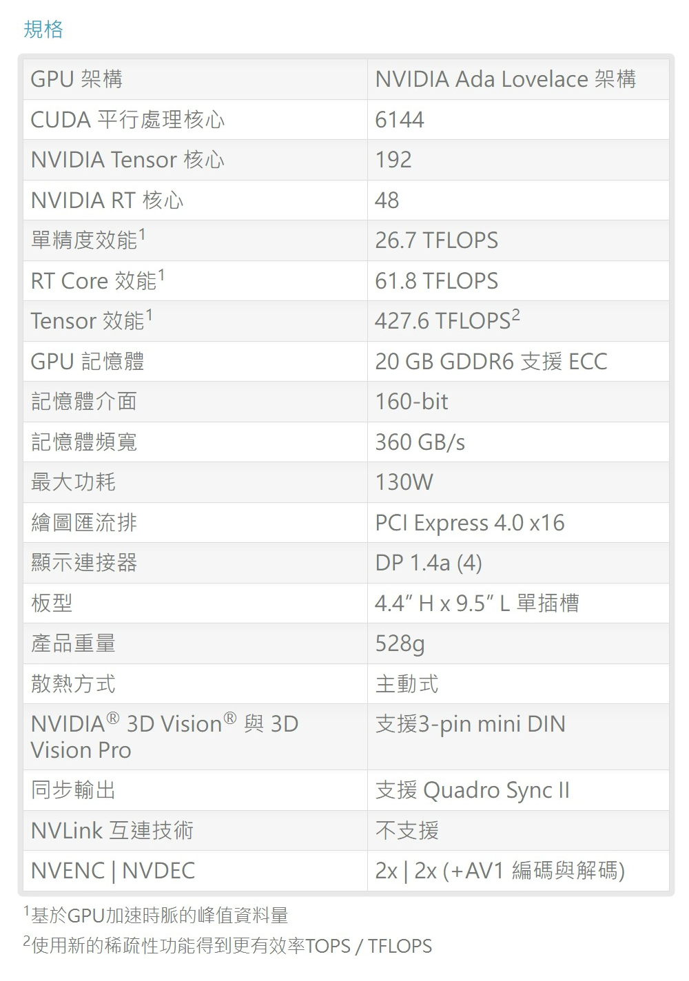NVIDIA RTX 4000 SFF Ada 20GB GDDR6 160bit 工作站繪圖卡,小型機箱(SFF)