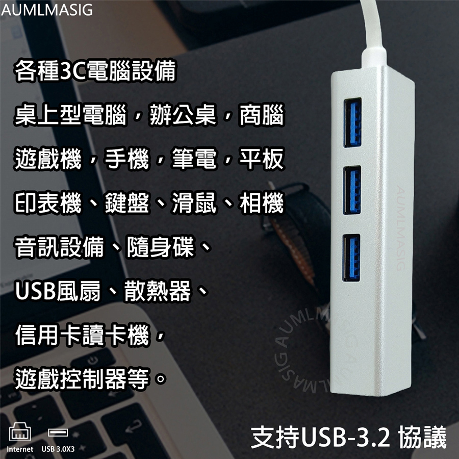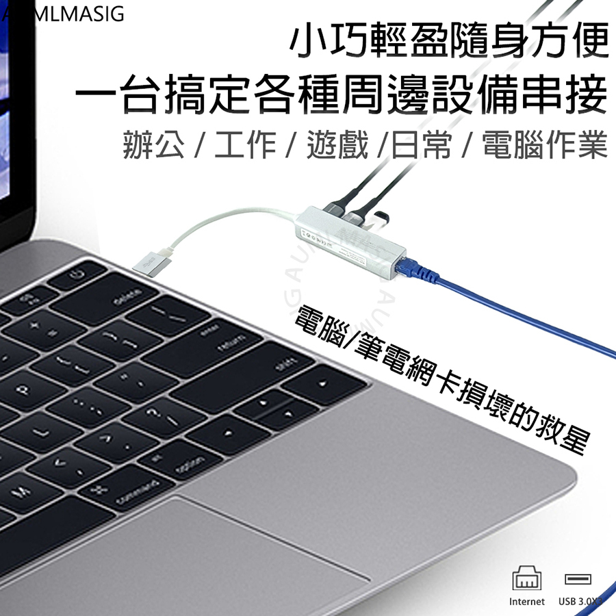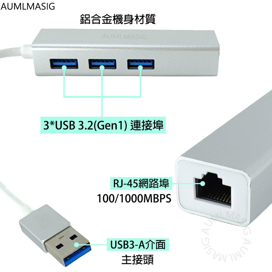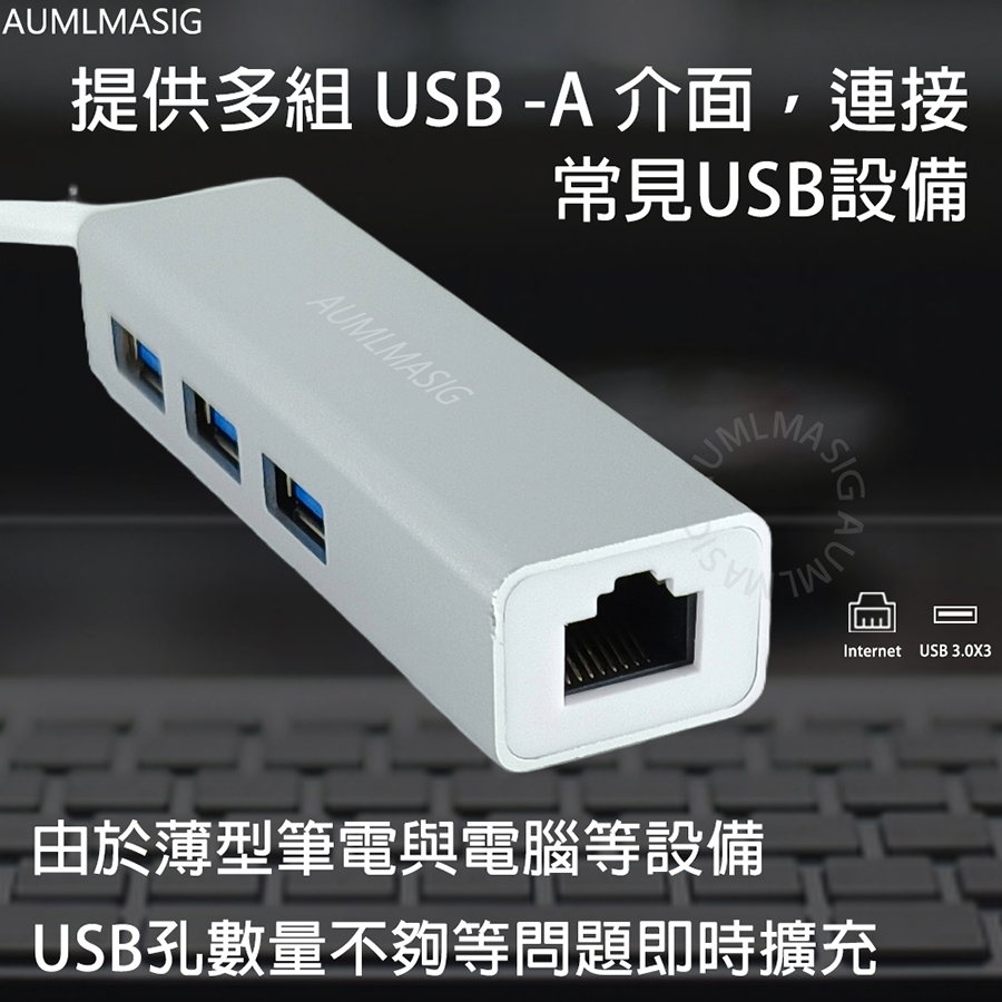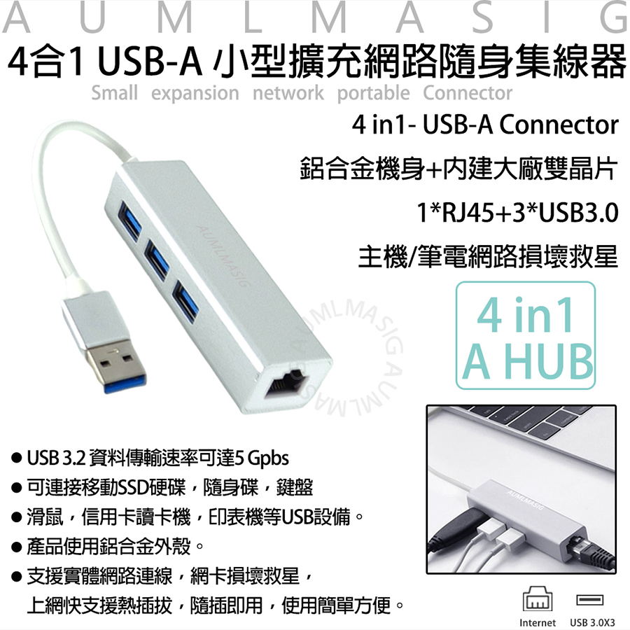 [AUMLMASIG] 4-in-1 USB-A small expansion network RJ45 portable hub / USB TYPE-A to RJ45 wired network adapter 1000Mbp, aluminum alloy body + built-in dual-chip 1*RJ45+3*USB3 .0 A savior for host/laptop circuit damage*USB 3.2 data transfer rate up to 5 Gpbs*Can be connected to mobile SSD hard drives,