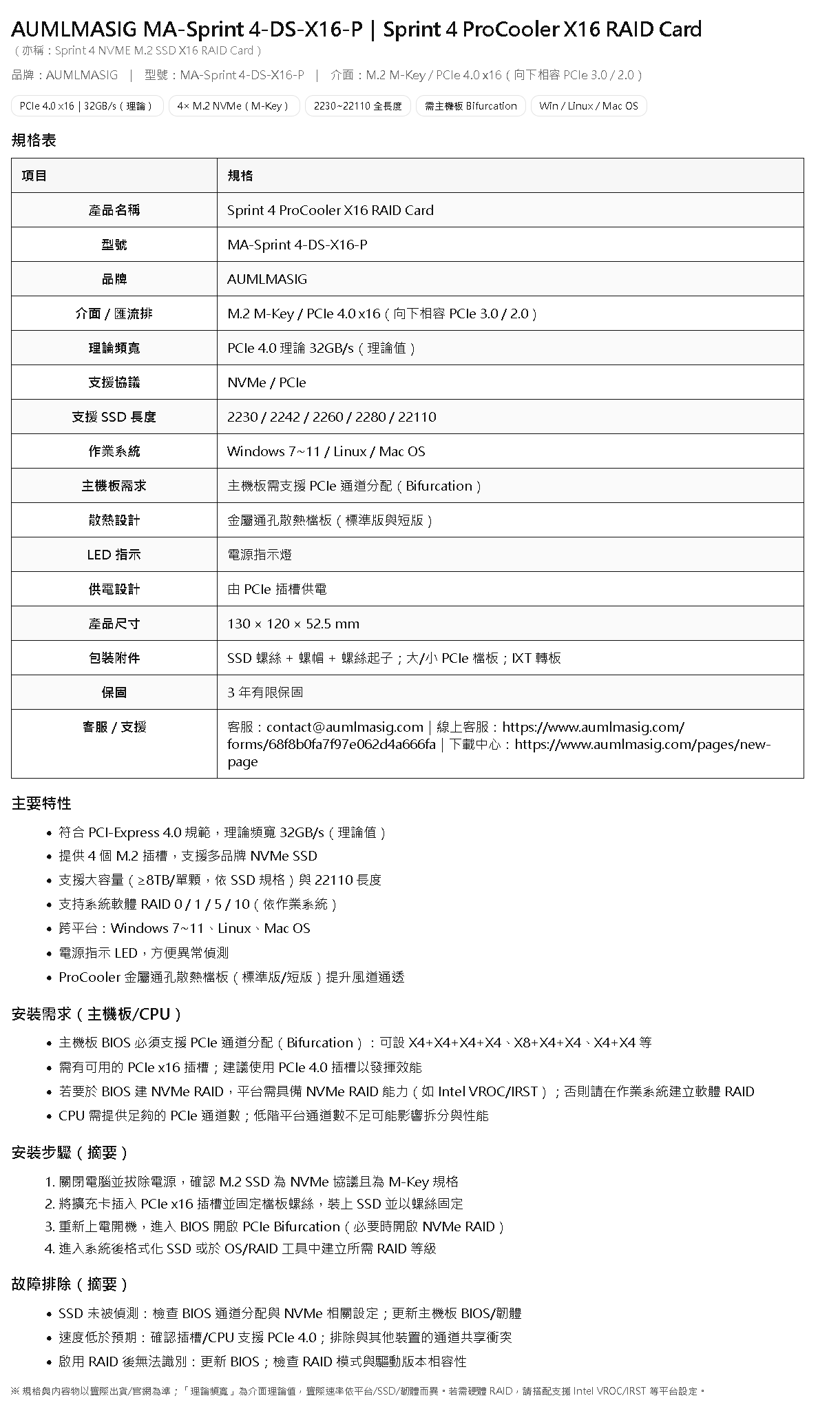 【AUMLMASIG】【Sprint 4 ProCooler RAID】 SPRINT 4 NVME SSD固態硬碟 M.2 M-Key TO PCI-E16X 軟RAID擴充轉接卡 支持單條8TB容量/支持WIN系統/LINUX系統 支持2280規格 高速傳輸32000MB/S 運作LED燈指示
