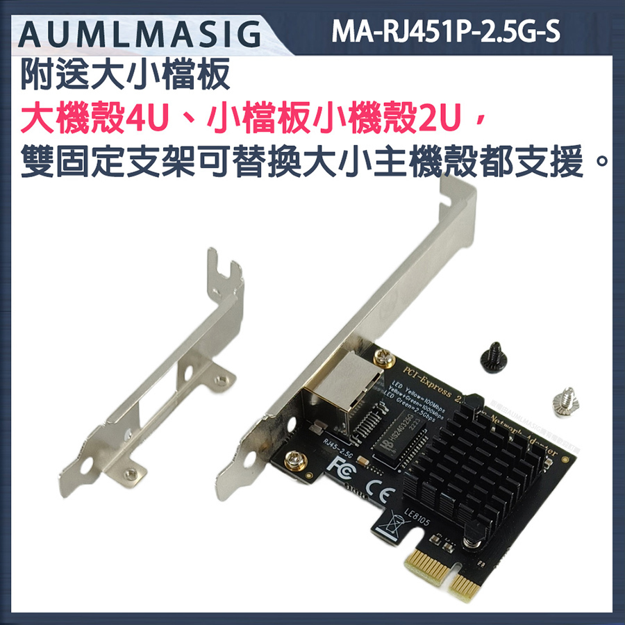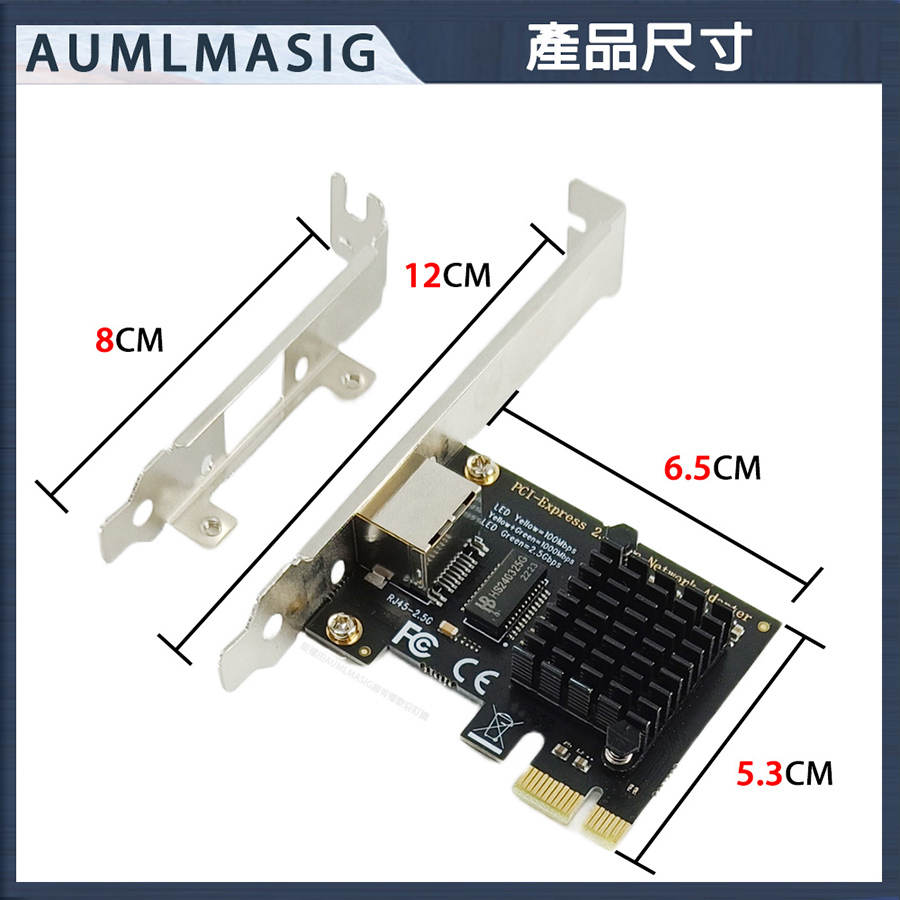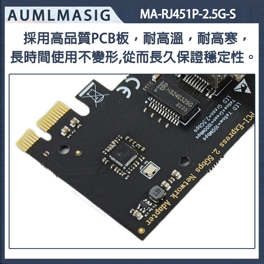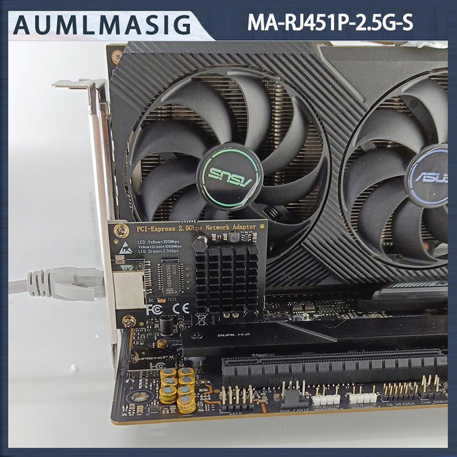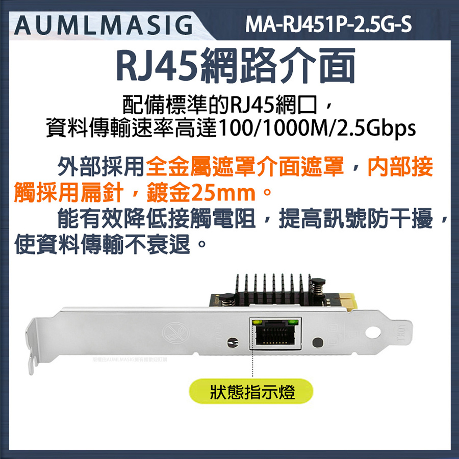 AUMLMASIG 2.5GbE 乙太網路介面卡 桌上型電腦2.5G乙太網路PCI-E卡 Realtek網路晶片 MA-RJ451P-2.5G-S PCI-Ex1插槽 支持PCI Express  總線 支持IEEE 降低 CPU 使用率 NAS/桌機/家用/工作站 暢快穩定性能強 極速上網低延遲 網速最高2500Mbps 遊戲電競/高網速/影音傳輸快 NAS/伺服器/電競/家用高速網路