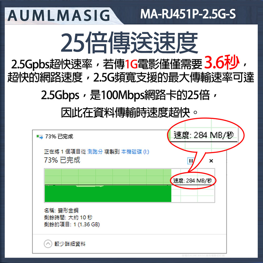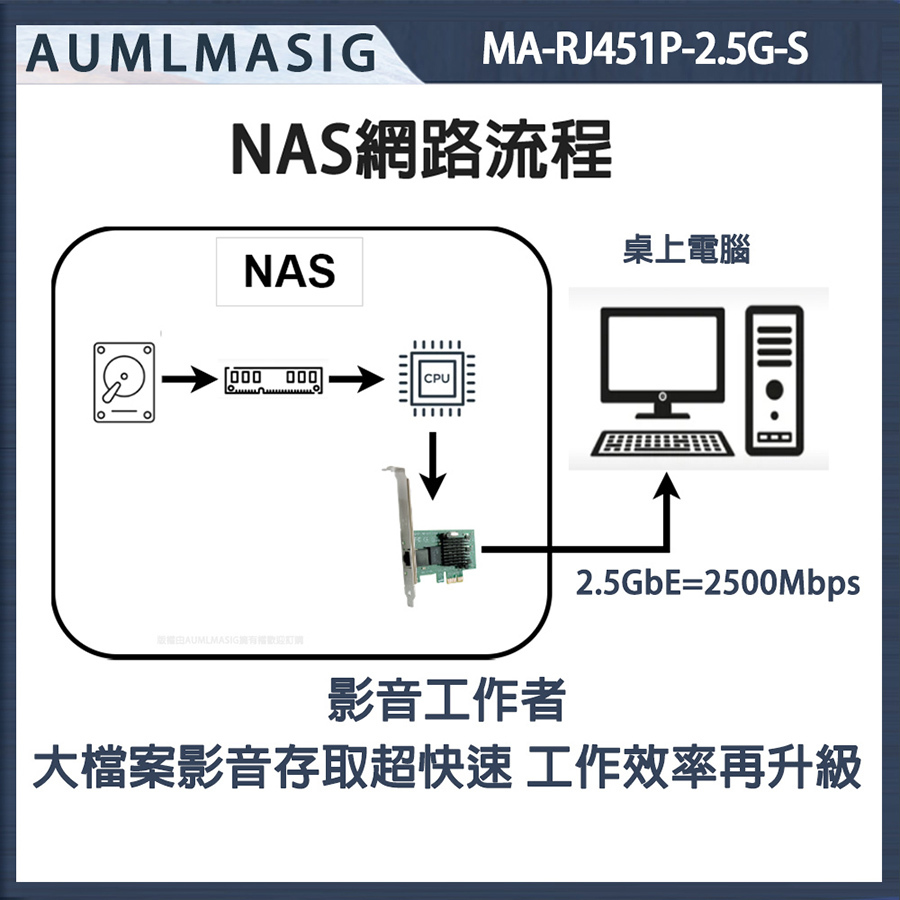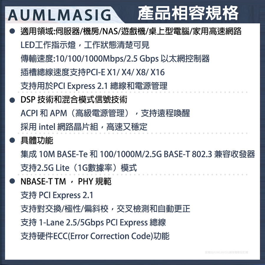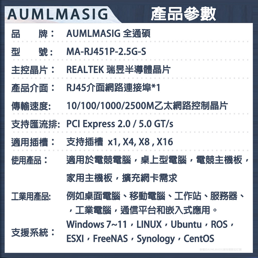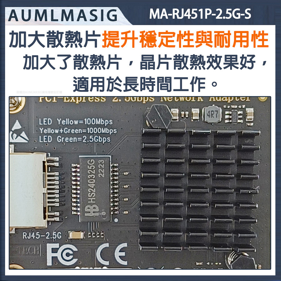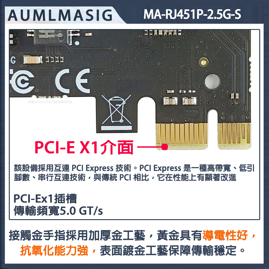 AUMLMASIG 2.5GbE 乙太網路介面卡 桌上型電腦2.5G乙太網路PCI-E卡 Realtek網路晶片 MA-RJ451P-2.5G-S PCI-Ex1插槽 支持PCI Express  總線 支持IEEE 降低 CPU 使用率 NAS/桌機/家用/工作站 暢快穩定性能強 極速上網低延遲 網速最高2500Mbps 遊戲電競/高網速/影音傳輸快 NAS/伺服器/電競/家用高速網路