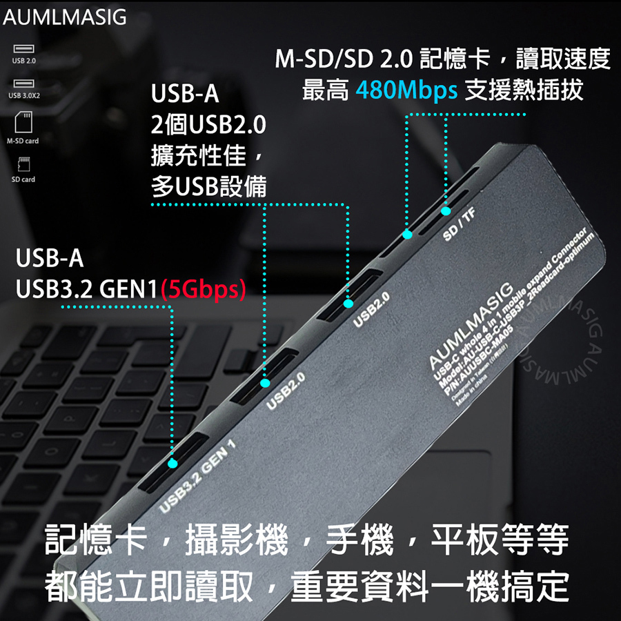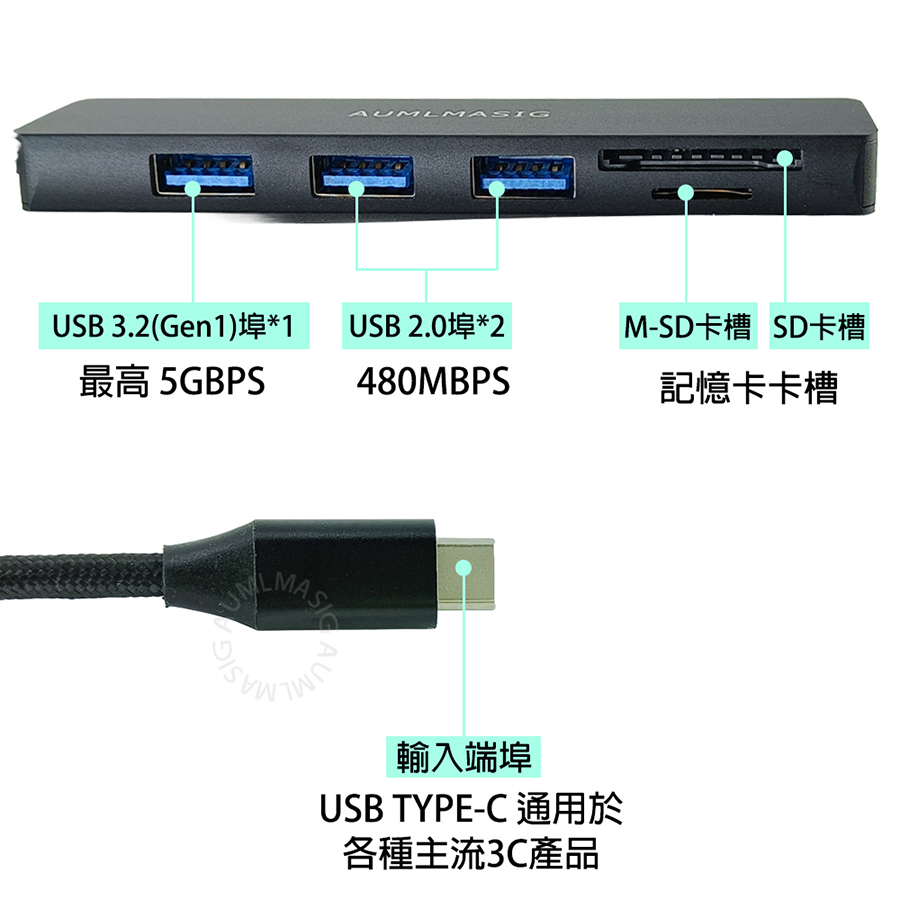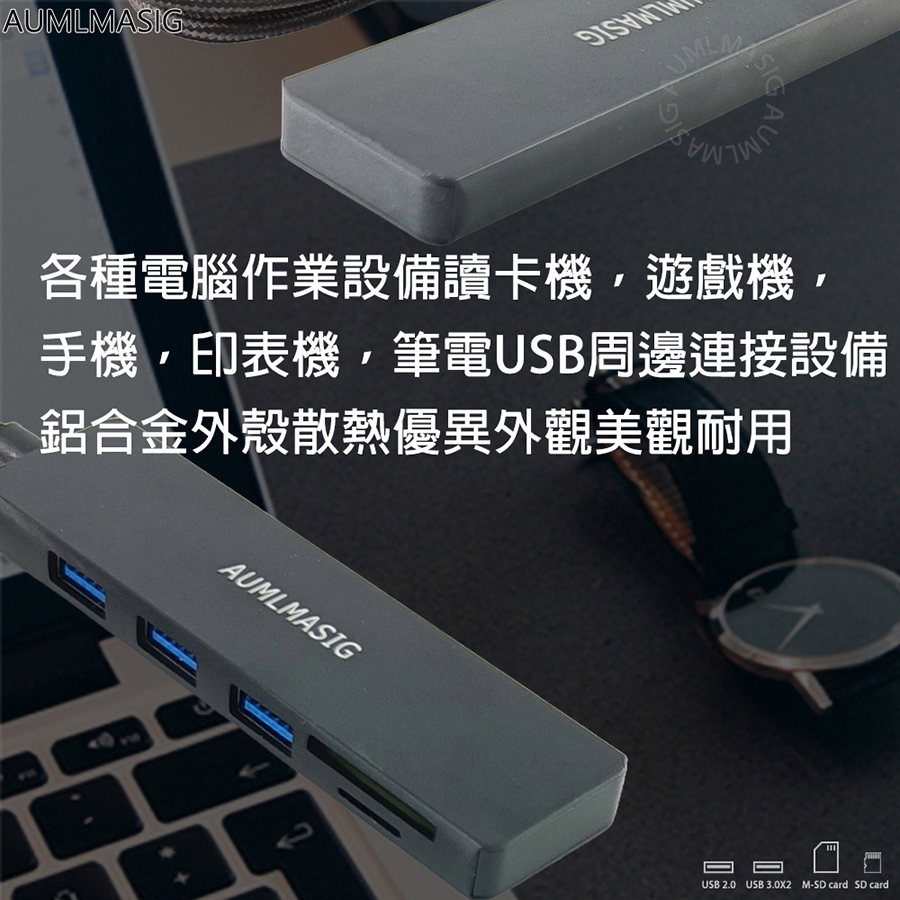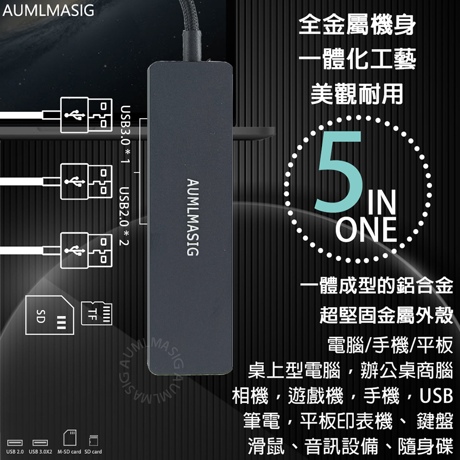 【AUMLMASIG全通碩】5合1 USB-A 3.2USB 5合1擴充隨身集線器 全金屬機身+USB擴充+讀卡